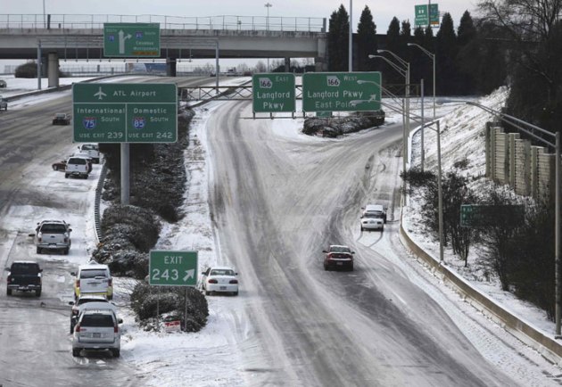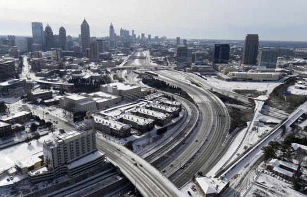 In this aerial view looking south toward downtown Atlanta, the ice-covered interstate system shows the remnants of a winter snow storm Wednesday in Atlanta. While such amounts of accumulation barely quality as a storm in the north, it was enough to paralyze the Deep South. (AP)