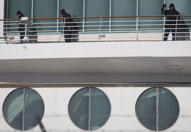 Workers shovel snow off a deck after Royal Caribbean's cruise ship, Explorer of the Seas arrived back at Bayonne, New Jersey. An outbreak of a gastrointestinal illness has forced the ship back to port early and left hundreds of passengers and crew stricken according to U.S. Centers for Disease Control and Prevention. (Reuters)