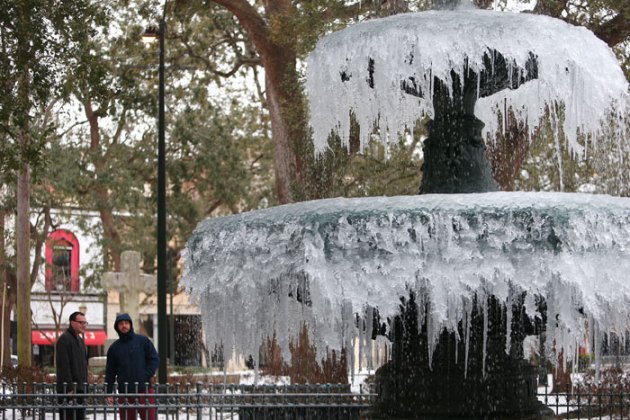 Cody Carpp, left, and Michael Gane, both of Mobile, Ala., walk through Bienville Square as ice covers downtown Mobile and temperatures remain below freezing on Wednesday.