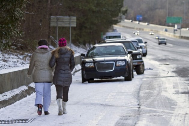 Two women retrieve their stranded car from Interstate 285 in Atlanta, Georgia. The women left the car by the interstate the night before after getting stuck in the ice and snow. (Reuters)
