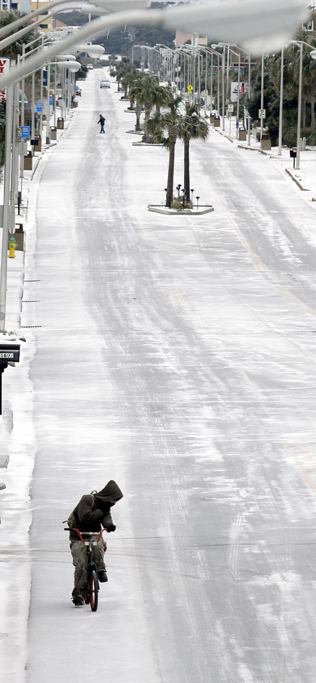 Traffic moves slowly on Ocean Boulevard in Myrtle Beach, S.C. A rare snowstorm left thousands across the U.S. South frozen in their tracks, with workers sleeping in their offices, students camping in their schools, and commuters abandoning cars along the highway to seek shelter in churches or even grocery stores. (AP)