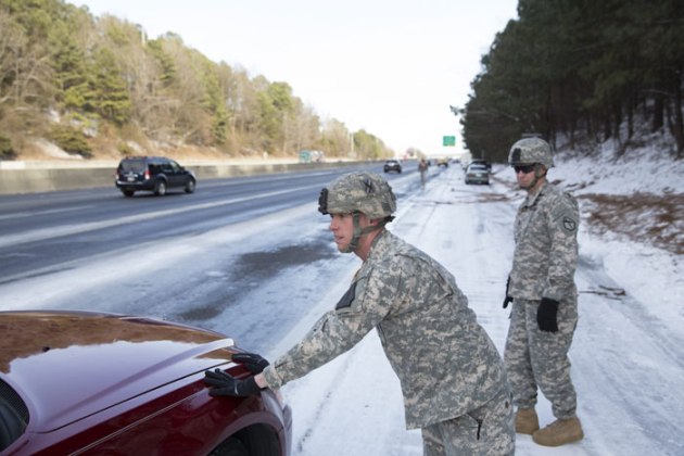 Georgia National Guard troops Sgt. Chad Armstrong (L) and Command Sgt. Maj. Buddy Grisham help people get their stranded cars out of the snow in Atlanta, Georgia. (Reuters)