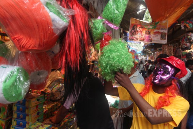 A man tries a colourful wig and mask a head of Holi. (IE Photo: Partha Paul)