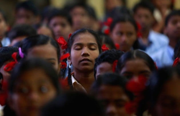 India schoolgirls offer prayers for victims killed in a Taliban attack on a military-run school in Peshawar, in Mumbai. (Source: AP)