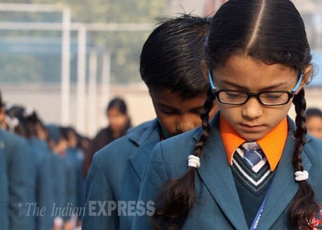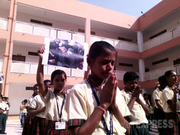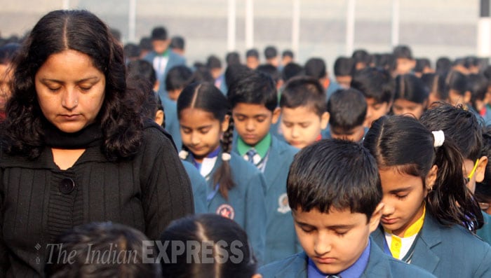 The 2-minute silence was observed after Prime Minister Narendra Modi's appeal. He wrote: "In the wake of dastardly attack in Pakistan, I appeal to schools across India to observe 2 mins of silence tomorrow as a mark of solidarity." (Source: Express Photo by Prem Nath Pandey)