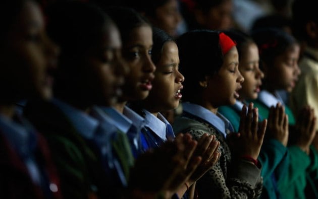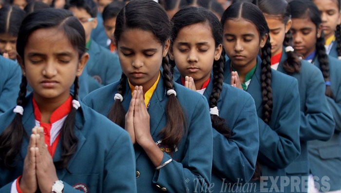 Kids praying at a school in Ahmedabad. (Source: Express Photo by Javed Raja)