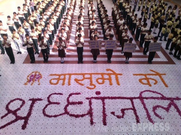 Children along with their teacher observing a 2-minute silence. (Source: Express Photo by Prem Nath Pandey)