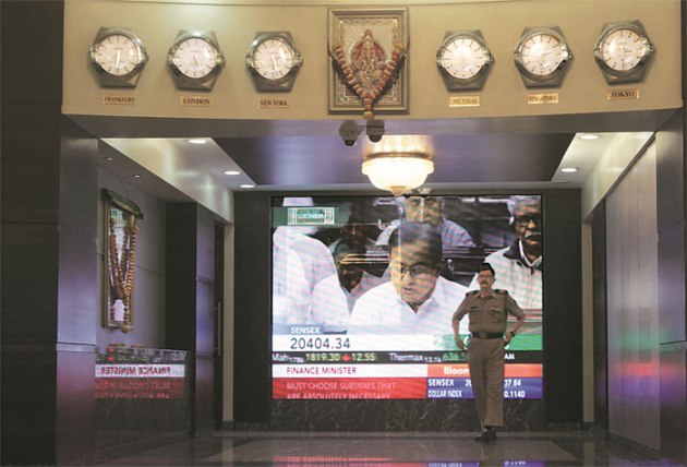 Interim budget session being broadcast on the screen at Stock exchange in Mumbai. (IE Photo: Ganesh Shirsekar)