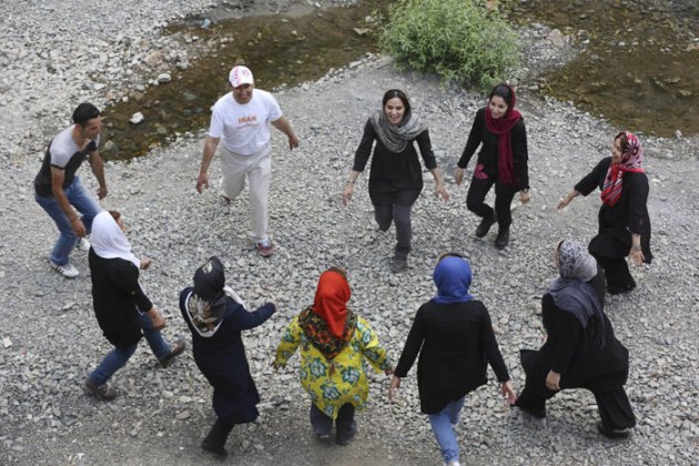 Laughter Yoga instructor Mahroo Sameni, right, leads a class in an outdoor session in the Darakeh mountainous area north of Tehran, Iran. (Source: AP)