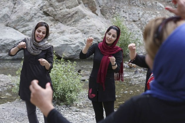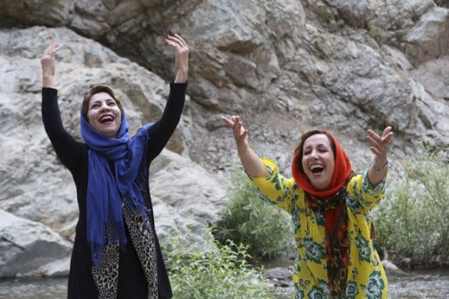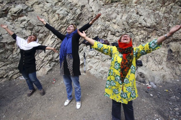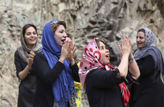 A group of Iranian women take part in an outdoor session of Laughter Yoga in the Darakeh mountainous area north of Tehran, Iran. (Source: AP)