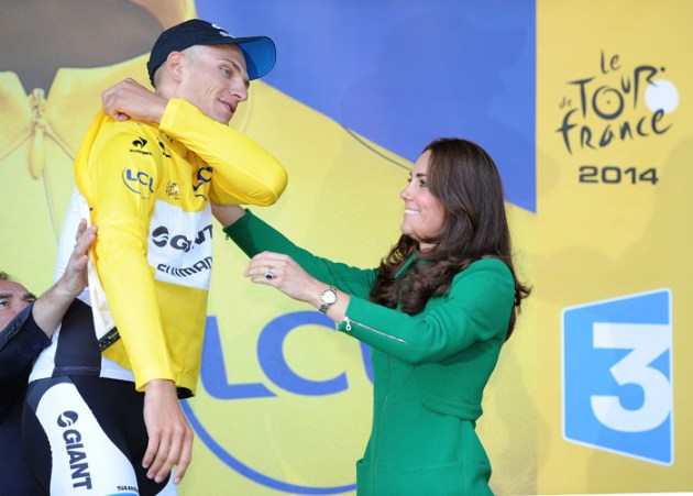 The Duchess of Cambridge bestows the first race leader's yellow jersey to Giant-Shimano team rider Marcel Kittel of Germany at the day's awards ceremony, after he won the first 190.5 km stage of the Tour de France cycling race. (Source: Reuters)-