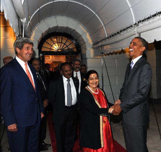 US President Barack Obama greets External Affairs Minister Sushma Swaraj. (Source: Twitter)