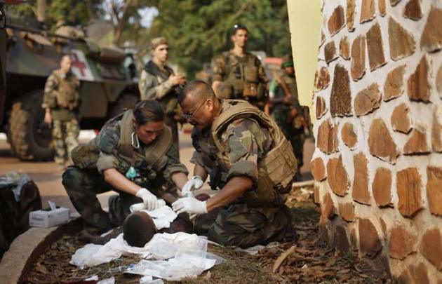 French medics treat a man they found in a cell with a slit throat after Seleka Muslim militias evacuated the Camp de Roux. (AP Photo)
