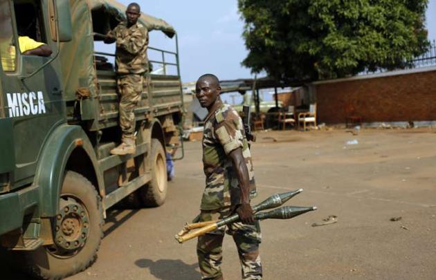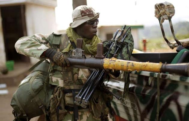 A Seleka Muslim militiaman holding a RPG drives a tractor through Bangui, Central African Republic, Monday Jan. 27, 2014, after evacuating the Camp de Roux downtown to relocate and join other Selekas at the PK11 camp. The clearing out of Camp de Roux normally the army's main base in the capital comes more than two weeks after rebel leader-turned-president Djotodia surrendered power amid mounting international condemnation of his inability to stop sectarian bloodshed. A new interim civilian government has pledged to halt the violence and attempt to organize elections no later than February 2015. (AP Photo/Jerome Delay