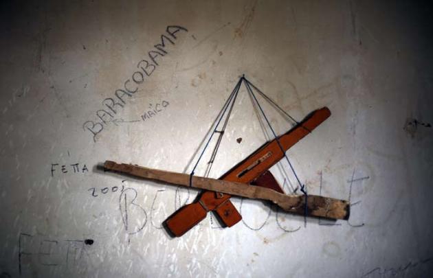 Fake wooden guns hang in Jean Bedel Bocassa's Berengo palace near Pissa, some 80 km south west of Bangui. Up to 500 registered cadets are stationed in the palace turned training camp, without any officers, hunting mice and birds for food, using wood fake weapons and awaiting instructions that do not come. In Mbaiki, down the road, a local commander of the Muslim Seleka blamed Christian anti Balaka militias for sending the country into chaos and vowed reprisals if the newly appointed interim government would not put an end to Muslim killings in the country. (AP Photo)