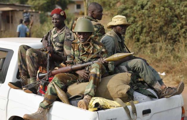 Seleka Muslim militias drive through Bangui after evacuating the Camp de Roux. (AP Photo)