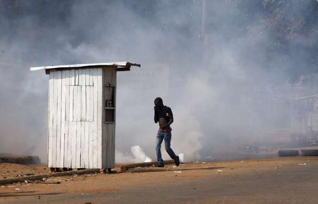 A man reacts to tear gas fired by French peacekeepers to disperse a crowd during continuing sectarian violence in Miskine. (Reuters)