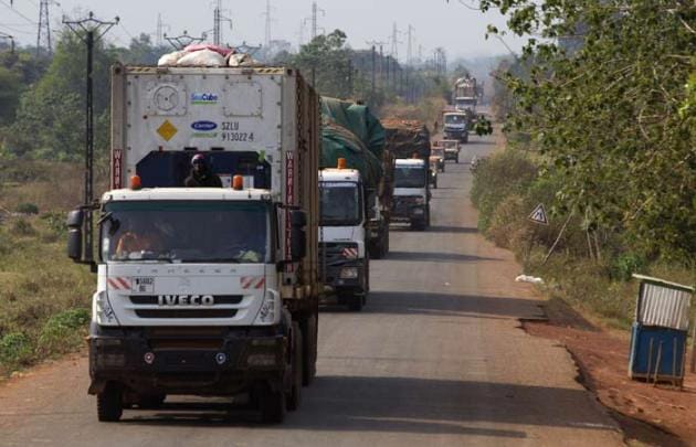 A convoy of trucks carrying food from the United Nations World Food Programme that was stuck at the Cameroon-Central African Republic border for several days due to sectarian insecurity on the road, approaches the north of Bangui. (Reuters)
