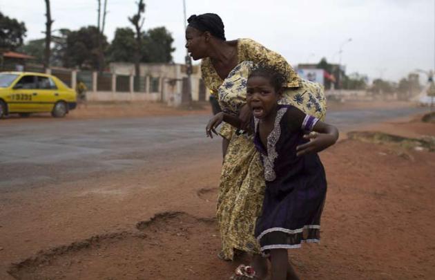 A mother holds her child while attempting to take cover as repeated gun shots are heard close to Miskine district during continuing sectarian violence in Bangui. (Reuters)