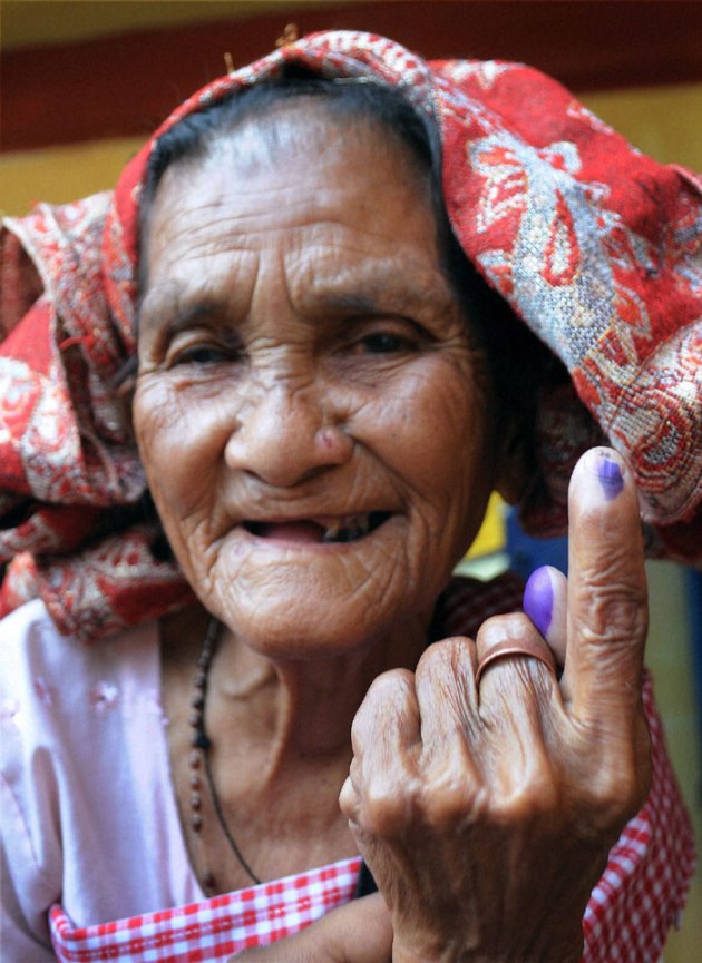 An old lady showing her finger mark after casting her vote during polling at Ri Bhoi District in Meghalaya on Wednesday. (PTI)