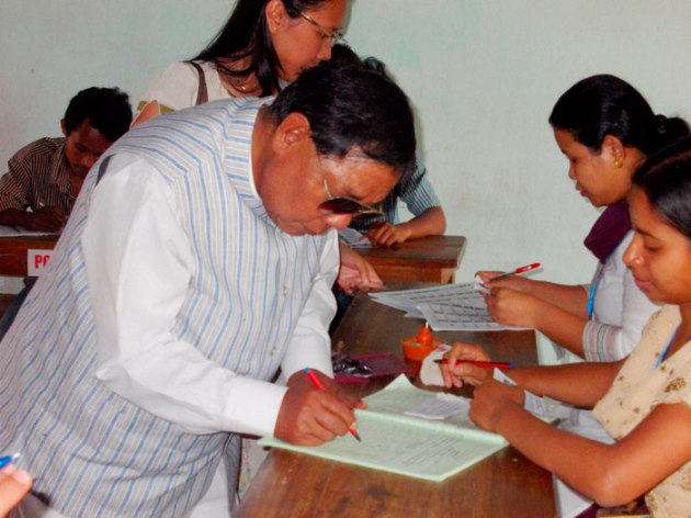 Sangma signs before casting his vote at a polling station during the second phase of polling for Lok Sabha elections at Tura in Meghalaya on Wednesday. PTI