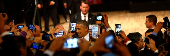 US President Barack Obama interacts with audience after he delievers speech at the Delhi townhall event at Siri Fort auditorium in New Delhi on Jan 27th 2015. (Source: Express photo by Neeraj Priyadarshi)