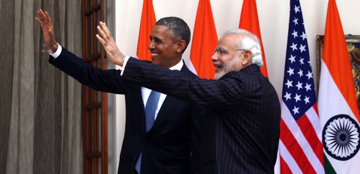 US President Barack Obama and India Prime Minister Narendra Modi waving hands at the reception. (Source: PTI)