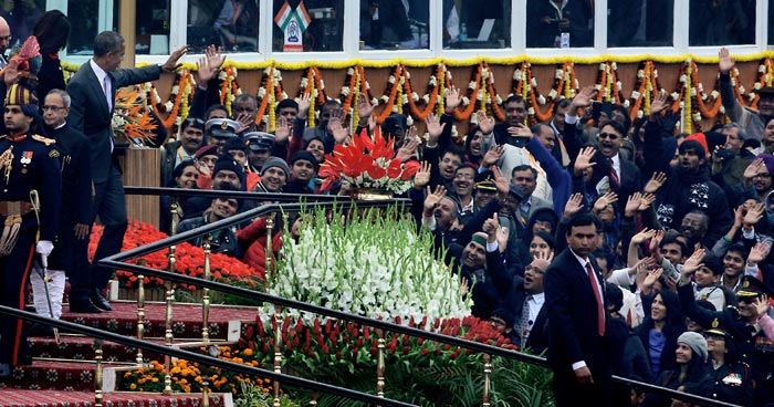 US President Barack Obama and Michelle Obama waves to public as they leave after the Republic Day function in New Delhi on Jan 26th 2015. (Source: Express photo by Neeraj Priyadarshi)