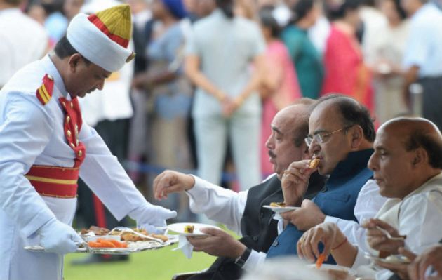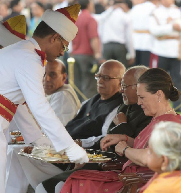 Vice President Mohammad Hamid Ansari,UPA Chairperson Sonia Gandhi and BJP Leader L K Advani,Home Minister Rajnath Singh, Finance Minister Arun Jaitley , Congress leader Ghulam Nabi Azad and during an ‘At home’ function on Independence Day at Rashtrapati Bhawan in New Delhi on Friday. (Source: PTI)