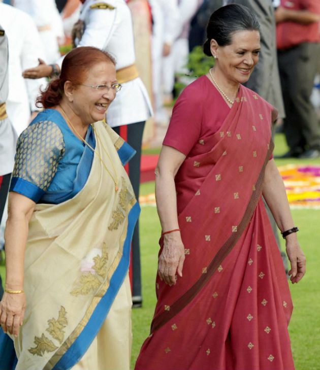 Lok Sabha Speaker Sumitra Mahajan with Congress President Sonia Gandhi during an ‘At home’ function on Independence Day at Rashtrapati Bhawan in New Delhi on Friday. (Source: PTI)