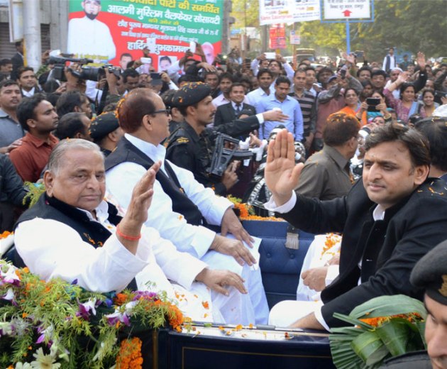 SP chief Mulayam Singh Yadav with Uttar Pradesh Chief Minister Akhilesh Yadav, minister Azam Khan and Shivpal Yadav riding a buggy, brought from London, in Rampur on Friday. (Source: PTI)