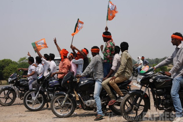 Bharatya Janata Party supporters gather on bikes with the BJP flag. (IE Photo: Neeraj Priyadarshi)