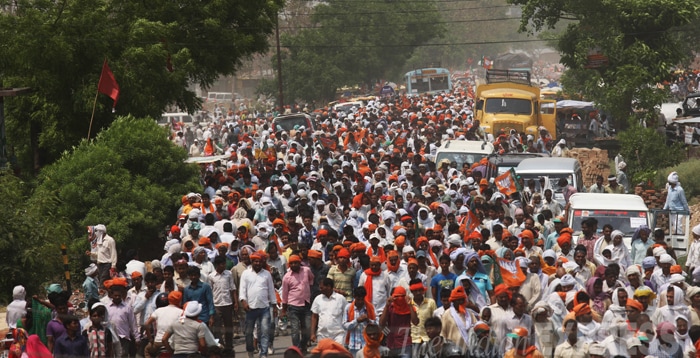 BJP Prime Ministerial candidate Narendra Modi arrives in Azamgarh, Uttar Pradesh, to address a rally after being denied permission by poll authorities to hold a public meeting in Varanasi.