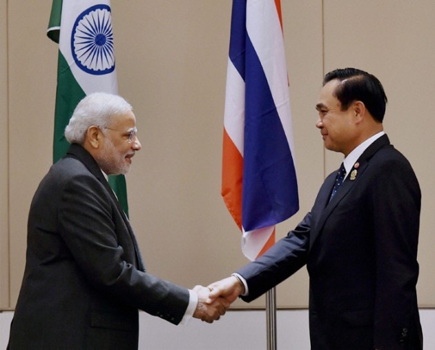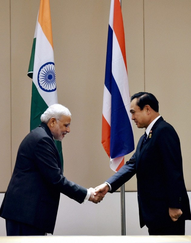 Prime Minister Narendra Modi shakes hands with Thai Prime Minister Gen Prayuth Chan-ocha during a meeting at Nay Pyi Taw in Myanmar on Wednesday. (Source: PTI)