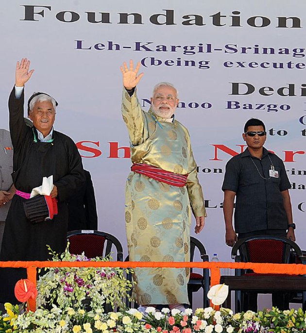 Prime Minister Narendra Modi waves during foundation stone laying ceremony for Leh-Kargil-Srinagar transmission system in Leh on Tuesday. (Source: PTI)