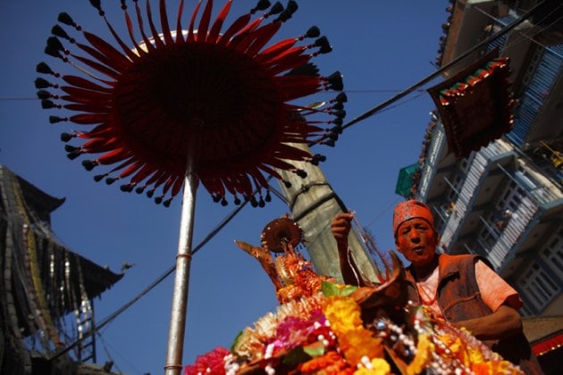 A Nepalese man decorates a chariot during Sindoor Jatra festival in Bhaktapur, Nepal for the New Year celebrations. (AP)