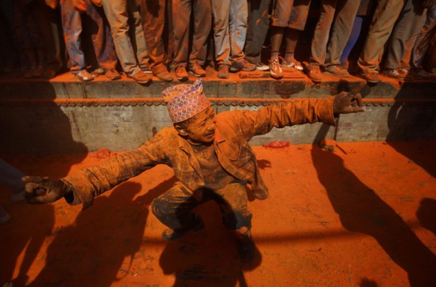A Nepalese man, covered in vermillion powder, dances during Sindoor Jatra festival in Bhaktapur. (AP)