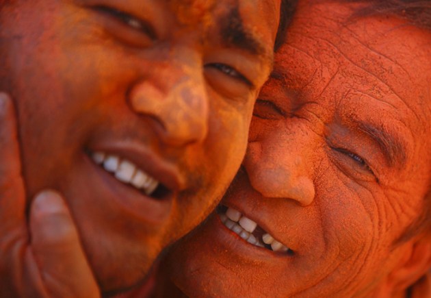 Devotees whose faces are smeared with vermillion powder pose for a picture while celebrating the 'Sindoor Jatra' vermillion powder festival in Thimi, near Kathmandu. (Reuters)
