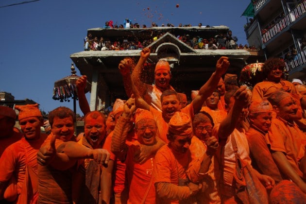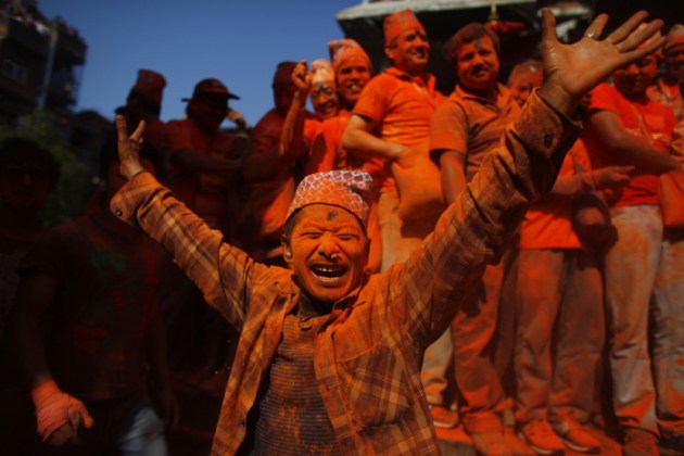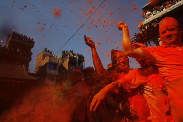 Nepalese men throw sindoor to celebrate Sindoor Jatra festival in Bhaktapur. (AP)