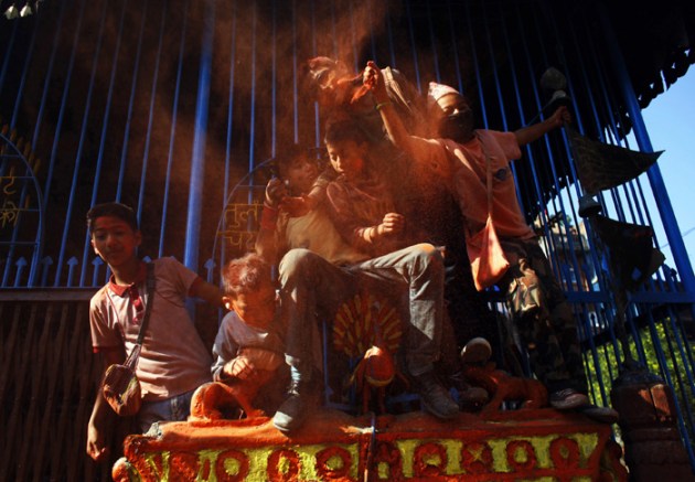 Nepalese children throw sindoor to celebrate Sindoor Jatra festival in Bhaktapur. (AP)