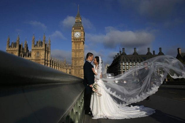 A couple poses for a wedding photographer in front of the Big Ben clocktower and the Houses of Parliament in central London, Britain May 7, 2015. Britain goes to the polls today in a knife-edge national election to elect a new parliament and prime minsiter. (Source: Reuters)