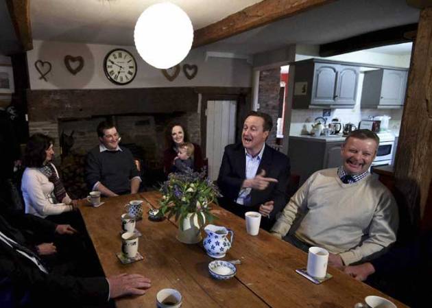 BRECON : Britain's Prime Minister and leader of the Conservative Party, David Cameron, 2nd right, enjoys talking with local members of the farming community during an election campaign visit at Whole House Farm, near Brecon, Wales, Wednesday May 6, 2015. Britain's political candidates are campaigning all across Britain in search of votes ahead of the May 7 General Election. (Source: AP)