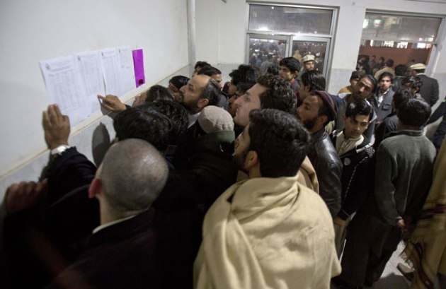 People look at lists of attack victims displayed at a local hospital in Peshawar, Pakistan on December 16. (Source: AP)