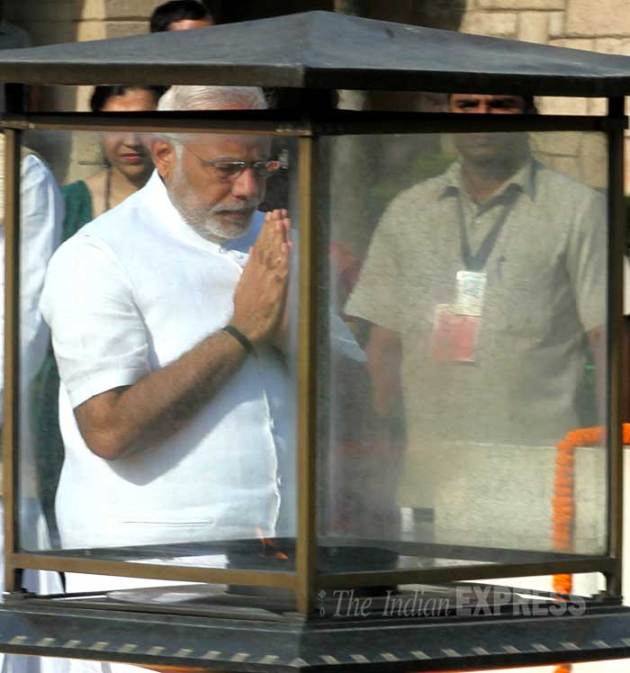 Narendra Modi spent around 10 minutes at Rajghat, the memorial to Mahatma Gandhi.(Source: Express Photo by Anil Sharma)