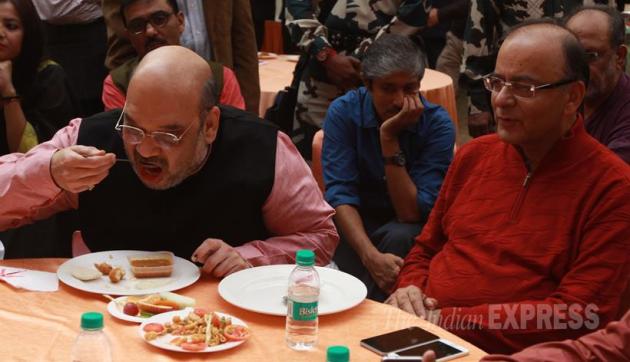 Seen in this picture - BJP chief Amit Shah and Finance Minister Arun Jaitley having lunch at the luncheon meeting organised for journalists in New Delhi. (Source: Express Photo)