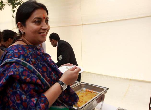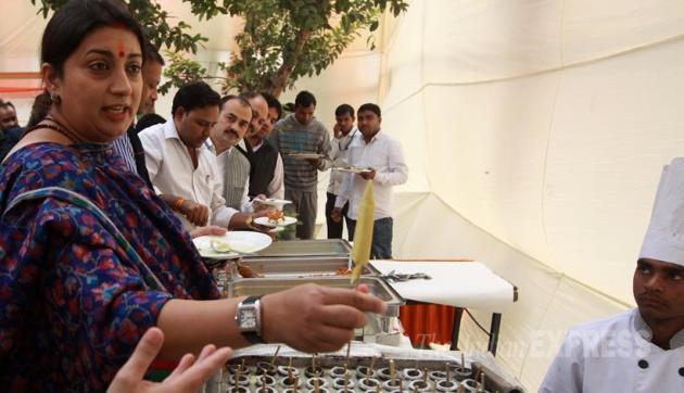 Union minister Smriti Irani having desserts during the Diwali Milan hosted by PM Narendra Modi at BJP Head office in new Delhi. (Source: Express photo by Prem Nath Pandey)