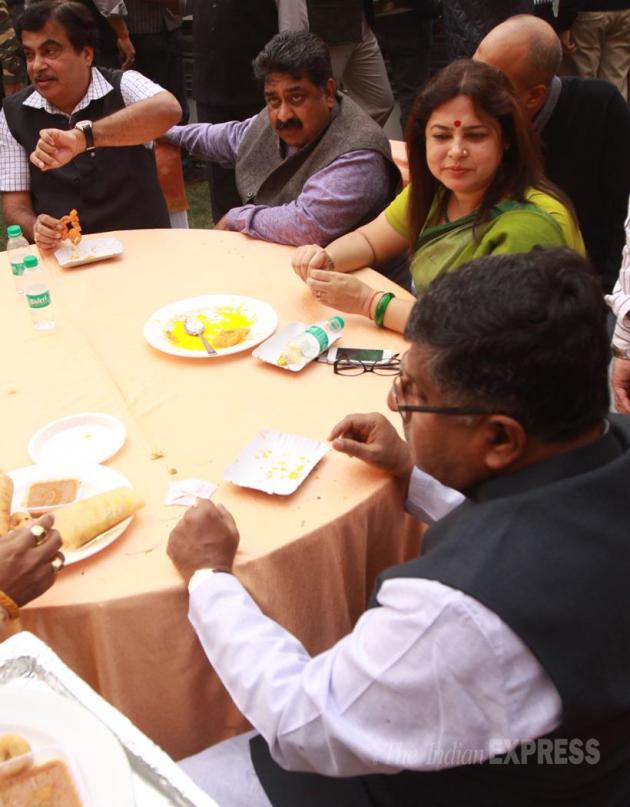 Union minister Nitin Gadkari, Ravi Shanker Prasad and MP Meenkashi Lekhi having lunch at the Diwali Milan luncheon meet at BJP Head office in new Delhi on Saturday. (Express photo by Prem Nath Pandey)