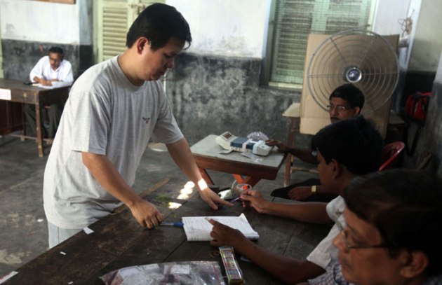 A voter casts his vote at Pei Mei Chinese School polling booth in Chinatown, Kolkata.( Source: Express photo by Partha Paul )