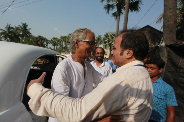 WBPCC President Adhir Chowdhury greets Left Front candidate Pramathes Mukherjee at a polling booth in Berhampore on Monday. ( Source: Express photo by Subham Dutta )