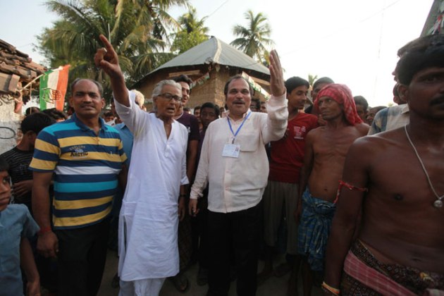 Adhir Chowdhury with Left Front candidate Pramathes Mukherjee visit a polling booth in Berhampore on Monday. ( Source: Express photo by Subham Dutta )